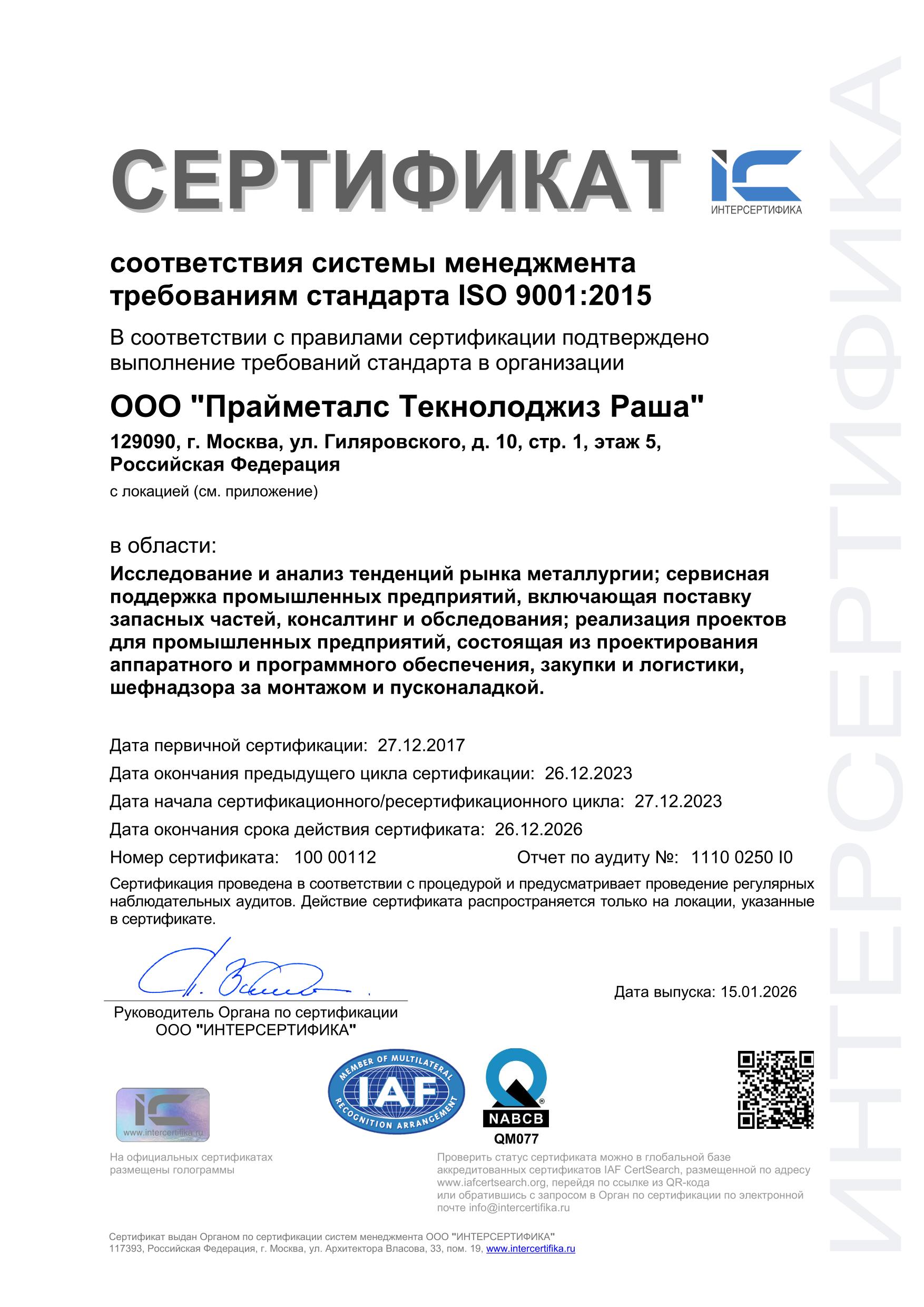 Сертификат соответствия Системы менеджмента качества требованиям стандарта ISO 9001:2015